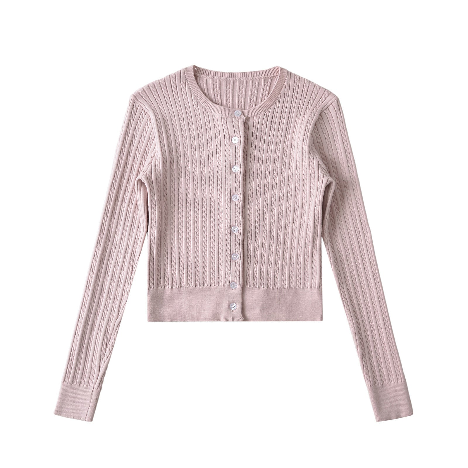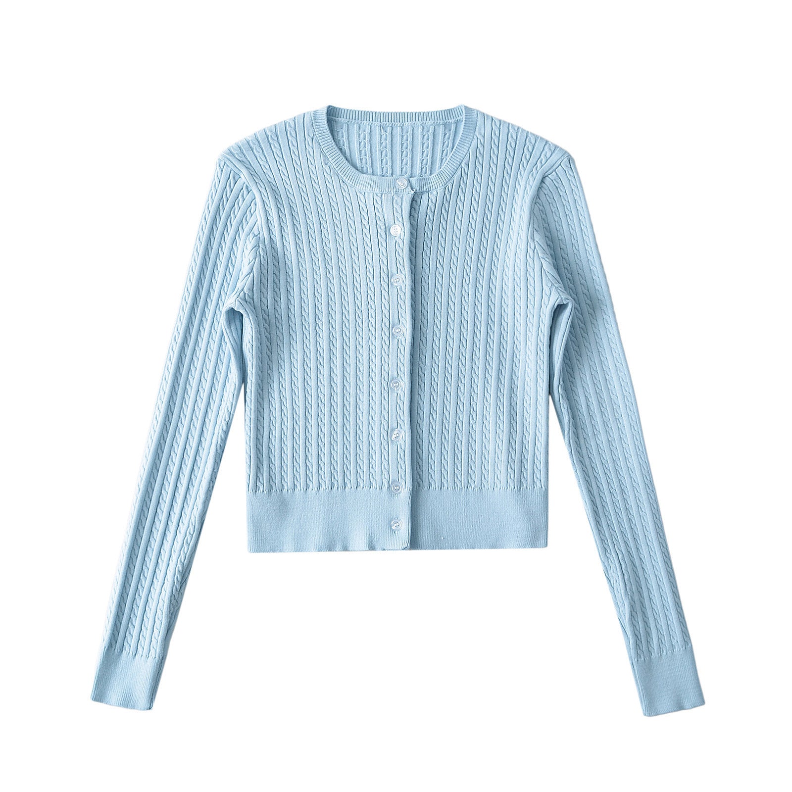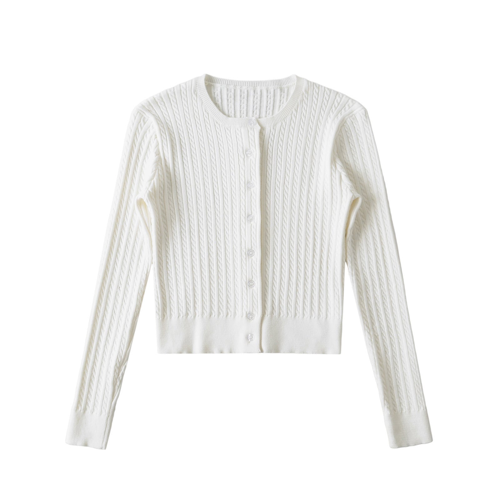 Discover the Lina Knitted Cardigan, a cropped top cardigan with braids, round neckline and long sleeves, fitted cut, perfect for an elegant street look.