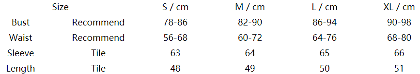 S: length 48 cm, bust 78-86 cm, waist 56-68 cm, sleeves 63 cm